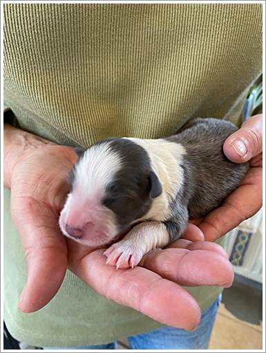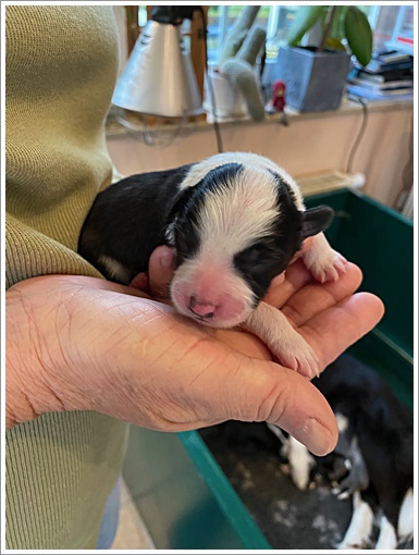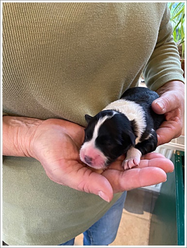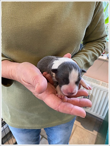 | TREEMOUNTAIN`S - Pringles Rufname: "Pringles" VDH/ZBrH BOC: DOB 29.12.2022 15:26 h 289 gramm Hündin black/white |